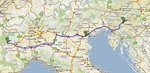 J'ai juste quelques mètres à faire pour prendre le café. J'avais remarqué cette nuit en venant qu'il y avait des bars dans tous les coins de rue en Slovenie, et coup de bol, j'en ai un à portée de main. Un bar de ZI, mais bien propret avec jardinières de fleurs, terrasse et tout. Face à la serveuse j'ai l'air con. Encore plus con que d'habitude parce que je sais pas comment on dit "Bonjour je voudrais un café s'il vous plait" en Slovène, J'ai falli dire "café solo" et j'ai tenté en Anglais, ça a marché. En fait ils parlent bien l'anglais ici, tant mieux. Avec le café j'ai pris un croissant et j'ai eu droit à la confiture, j'ai observé les gens, tout la monde à la banane ici, ça sent la bonne humeur tranquille, trés comment dire? Très Aveyron en fait. Passé mon étude ethnologique je mets en route prêt à affronter les bouchons du Ring Lubjanien, mais... pas de bouchon et en 5 minutes je suis déjà sorti de la capitale, en fait c'est tout petit la capitale de la Slovenie. J'ai regardé de partout, mais j'ai pas vu d'ours. J'ai juste pris la flotte avant la frontière à Gorizia, 20 minutes plus tard je suis sur l'A4 chez les ritals, finies les vacances. Grosse surprise, le nouveau contournement de Venise est terminé, avec ça plus de bouchons! Sauf que pour aller la ou je vais, à Dolo ça m'arrange pas, l'échangeur est tout chamboulé et j'y comprends que dalle. Sur le chemin il y a des panneaux interdits aux PL pour rejoindre ma rue, il y a pas le choix de toutes façons. C'est vrai qu'il faut suivre les interdictions PL pour trouver les ZI en Italie!
