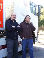 J'arrive pour 15h à Port Vendre, c'est la panique totale, des camions de partout... Bon, on ne s'affole pas, c'est pas la peine. Jerôme est là, et on passe l'après-midi ensemble. J'aime bien Jéjé, un vrai accro du camion. Finalement on ne sera rechargé qu'à 19h. Incroyable ce que vous pouvez bouffer comme bananes! Z'êtes des singes ou quoi? Je dois laisser Jéjé à sa coupure, et je file sur Perpignan. A la Satfer, je tombe par hasard sur Babar alors que je faisais le controle de la température, café, photo, une bonne demi-heure de passé, je fais le crochet par la douche au dépot, et à 21h30, je mets les voiles.