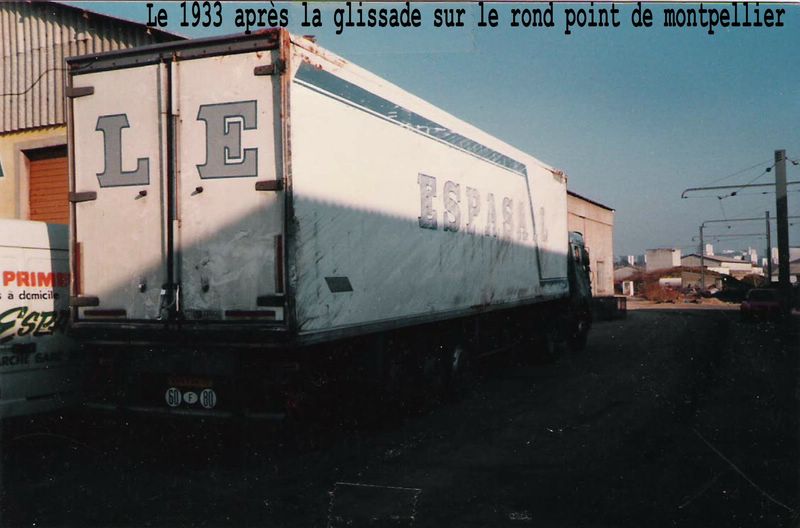 Le Mercedes et la remorque frigo après glissade. J'étais avec lui bien sûr, c'était un samedi fin de journée, nous avions chargé à St Charles à Perpignan et au retour mon père a livré la moitié de la semi au Super U à côté de Montpellier .
