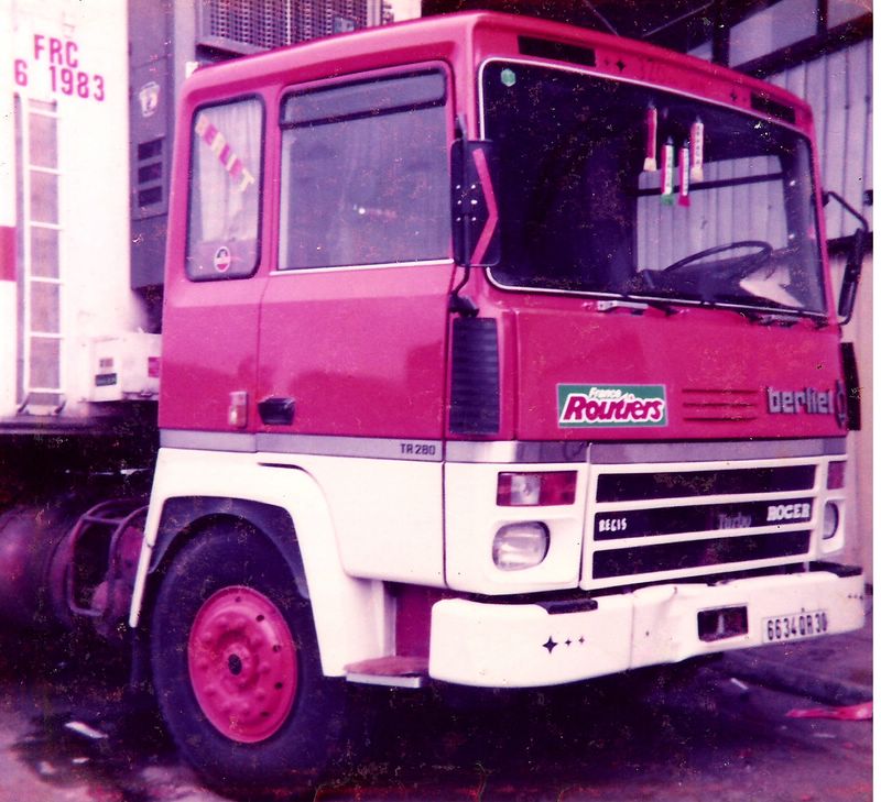 Il a donc commencé sur un Berliet de 160ch à fameuse cabine relax, couchette, pour moi.. et la caisse qui venait au dessus de la cabine, il faisait Nîmes Mulhouse pour livrer Euromarché. Plus tard, il a eu un Berliet TR 300 V8 en savoyarde ou il a commencé à faire Perpignan, suivi par le TR 280 et une semi frigorifique Frappa, toujours Perpignan, Agen, Marmande…