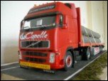 Le camion ci-dessous est un CAPELLE 1/24 que j'ai realisé pour les 30 ans de Michael dont c'est le premier ensemble attitré. Pour les précisions, j'ai mis pas loin de 200h pour le réaliser à l'identique, le plateau de marque (TBK) est une base Italeri, le tablier est renforcé avec des encolures pour les ronchets. J'ai ajouté un véritable plancher en balsa ou j'ai decoupé des lamelles, les cliques de sangles sont un kit edité par KFS, et les sangles sont du ruban que j'ai trouvé en mercerie, le tracteur est le FH 500 edité par Italeri, les jantes larges sont réalisées en découpant les jantes d'origine du kit, autocollant maison, les rideaux sont fais avec des bouts de tissus et de dentelles.