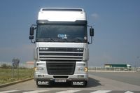 Réglage du poste de conduite, et on est parti. Le volant se règle en profondeur et peut s'incliner. Les pédales sont bien espacer et on ne risque pas de se tromper on d'appuyer sur les 2 en même temps. Obliger de démarrer en 1 er ou en 2eme même à vide ou en solo. A froid la 5 et la 6 à du mal à rentrer il faut forcer comme un sauvage pour les passer. Les 480 Ch. sont bien présents, et l'étagement de la boite aide bien à utiliser le couple du moteur. C'est pas un foudre de guerre au démarrage (cela permet de limiter la conso) mais il ne craint pas les faux plat ou les cotes (il n'allume pas les warning a la vue d'une cote). Le relief ne lui fait pas peur sauf les grandes monter avec 24 T ou la moyenne chute (au plus bas 40 Km/h dans la Turbie (sens Italie – France). Par contre il reprend en cote contrairement a d'autre camion, certain V8 en on fait la mauvaise expérience. Le V8 s'essouffle quand le DAF reprend (cela doit être du a l'étagement de la boite). Ce n'est pas un camion fait pour la distribution, car il faut jouer de la boite sans cesse. On est a bord d'un grand routier fait pour avaler les kilomètres.