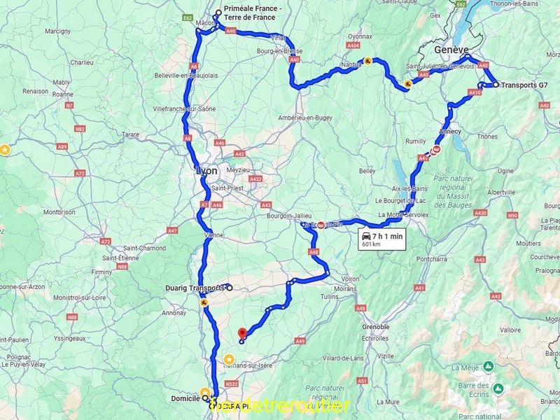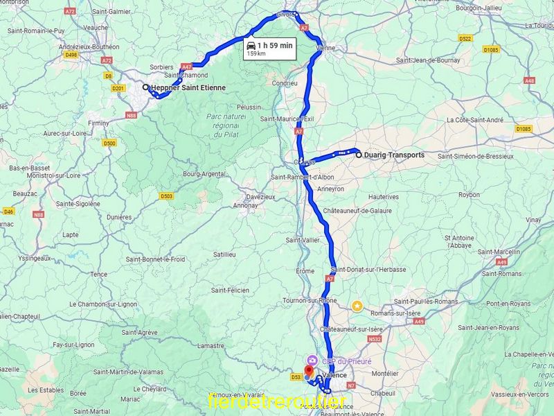 J'ouvre un œil vers midi, je retrouve mon voisin de parking au café. Comme mercredi dernier, je vais prendre un groupage à Andrézieux pour Carros. J'étais pas sûr de faire un 2e tour de primeur, là j'en suis certain ! Bon pas grave, il y a du café ici, c'est tout ce qui compte. Je donne vite les quelques racks qu'on avait empillé hier à Barcelone et j'attends sagement la fin de la coupure à 14h15. Comme j'avais pas envie de me fader Givors, j'ai pris les montagnes Russes par Brignais, j'aime bien passer par là, pas pressé et à vide, c'est encore mieux.
