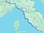 C'est à la 1ere station après Rome que je retrouve Lionel. Finalement on s'est décidé pour passer par Grossetto. Objectif, Villanova d'Asti ou Susa. Mais pour Susa, il va falloir que ça marche du tonnerre de Dieu. De nuit, ça roule nettement mieux, même si on est secoués comme des pruniers tout le long jusqu'à Grossetto, le materiel doit vraiment souffrir par ici. En tapant dedans, on arrive vers Viareggio pour couper 45.