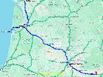 Une demi heure de sieste, au reveil j'ai la vue sur le Bassin d'Arcachon, le jour se lève c'est parfait. La route est une enfilade de petits bleds, peu de touristes mais une noria de camionettes d'artisans. A Cap Ferret, il y a même une toute petite voie ferrée pour aller à la plage, ça doit être sympa. Comme prévu le client m'attend, il fait jour on va pouvoir vider. Sauf que les maçons ne sont pas arrivés, et ce sont eux qui ont les clefs du manuscopique. Pas grave, j'ai le transpal et le hayon, le temps que je descende la première palette avec les gros piquets, ils arrivent, bon timing. Le coin est en zone protégée tout doit être selon des normes très précises, la cloture est obligatoirement en bois. Le prix des maisons, est apparement vertigineux ici, bah ça m'étonne pas, mais je suis aussi bien en Ardèche. De là, je me sauve, toujours sous une bonne pluie, impossible de faire des photos potables, pas grave y en a plein google. Je retourne vers la civilisation, ou je prends des pneus à Pessac chez speedy. Je complète avant midi dans le centre de Bordeaux, dans un autre Speedy garé sur la piste cyclable, pas le choix.