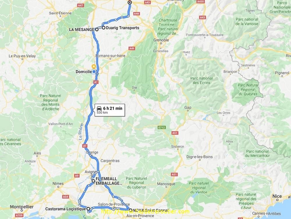 Ensuite j'ai le temps de secher, par chance je vais pas sur Avignon, c'est bloqué depuis Avignon NORD, l'horreur. Je remonte tranquille poussé par le vent du sud direction Romans sur Misère. Partout des branches cassées, plus ou moins grosses, je croise tous mes doigts pour que mon toit provisoire ne s'arrache pas. J'ai 2 ramasses de produits de nettoyage pour les agriculteurs, je ramène ça au dépôt.