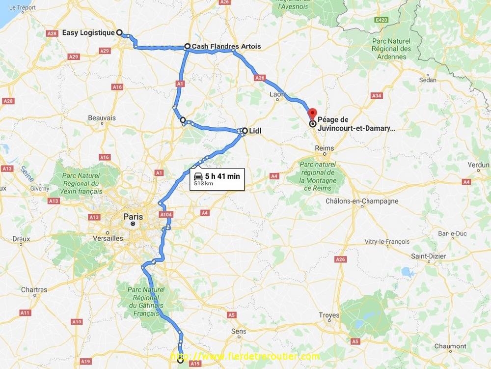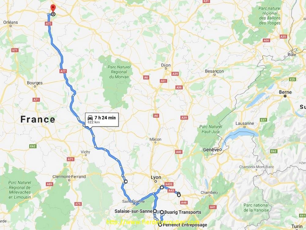 A 2, on a pas mis 30 minutes pour charger, je me suis pris 20 minutes pour becter, puis est tombé un hypothétique complément d'une palette de carrelage pour Lidl à Soissons à prendre à Feurs, l'autre pays du carrelage. Je passe la St Etienne capitale mondiale du football et du fusil de chasse sans bouchons, à 16h je suis à Civens. Le cariste est parti faire une course, faut attendre, pas le choix. Du coup, je monte tout par la N7, avec la nouveauté du moment la déviation de Villeneuve/Allier, ça sert pas à grand chose vu qu'il y a des cônes tout du long pour le moment. Ce soir, je vais au bout de mes 10h de guidon, demain ça me fera contourner Paris, capitale de la France vers les 7h30 du matin, du coup je me pose au péage de Montargis sur l'A19, il y a personne, on vera demain la décision à prendre.