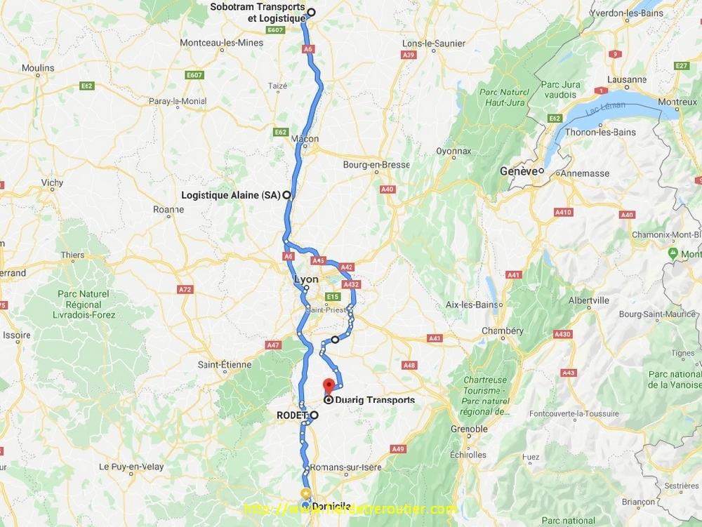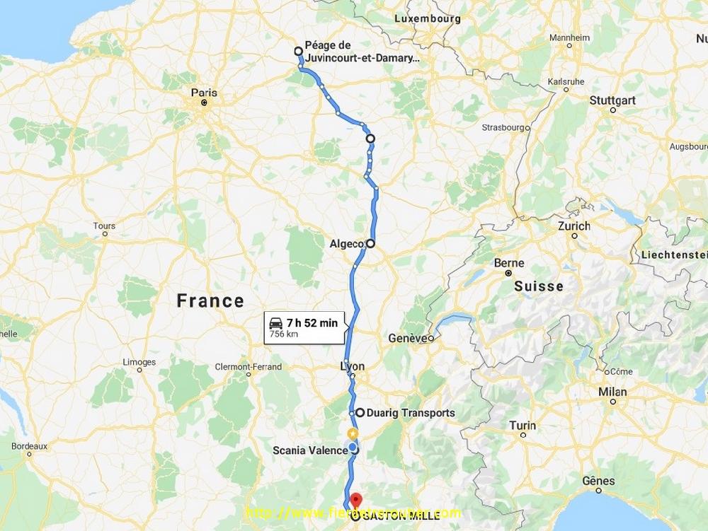 En remontant après Noves, on longe la Durance, je l'avais jamais vue aussi grosse et tumultueuse, il en faudrait pas beaucoup pour qu'elle traverse jusqu'à la route. Après un graillon à Livron, je prends une paire de palettes pour Palamos, je pose les cartons à la Mesange de Chambalud et le Palamos dans José, enfin dans sa remorque. Pour ma part j'ai une merdouille pour Bourgoin, et en me magnant le derche j'arrive à 18h à Nivollas, donc pas très loin de Bourgoin , ce qui fait que je peux valider une belle 11 ce soir, et ça, ça vaut tout l'or du monde !!!
