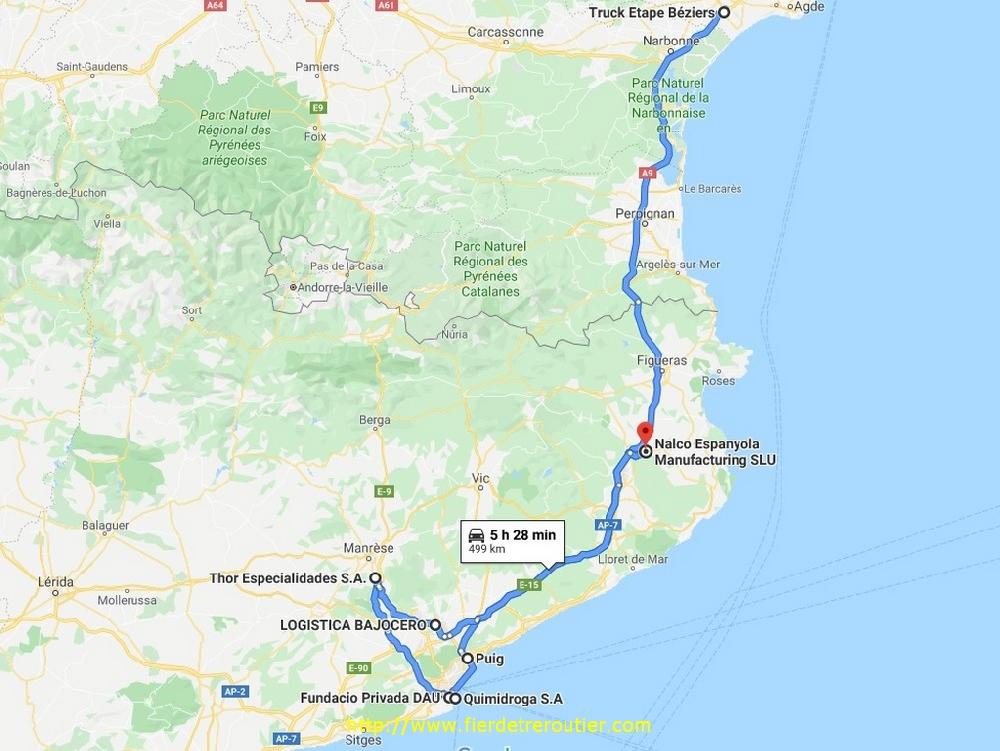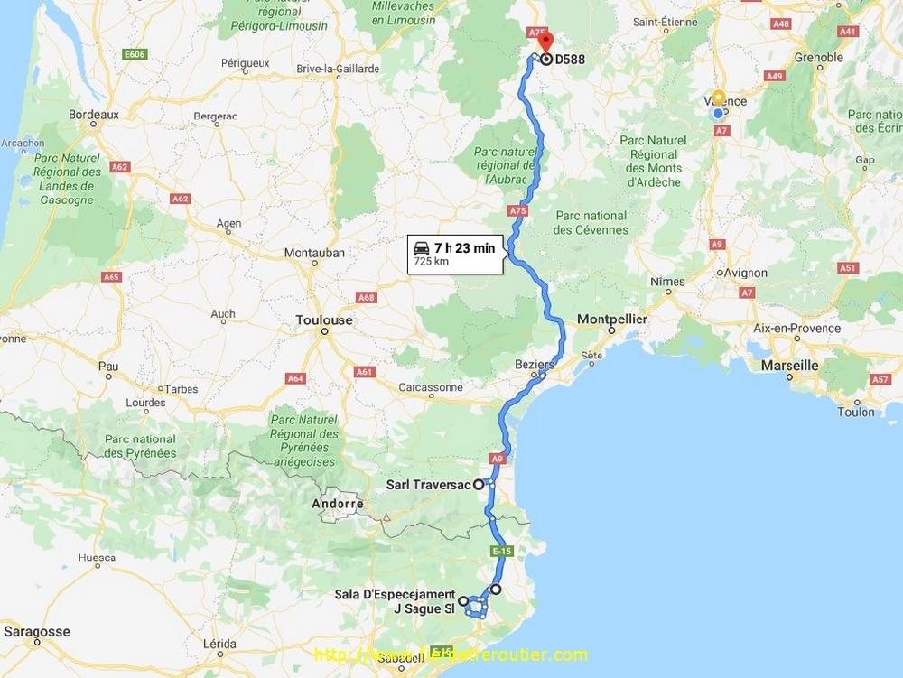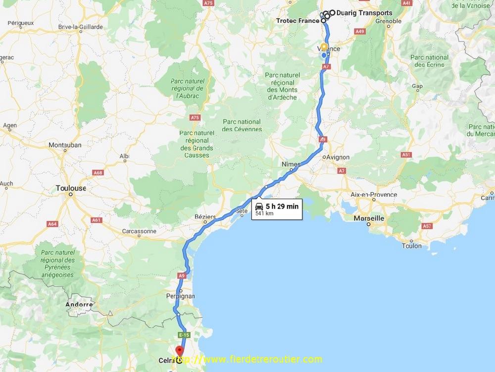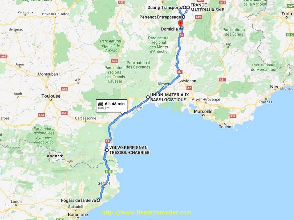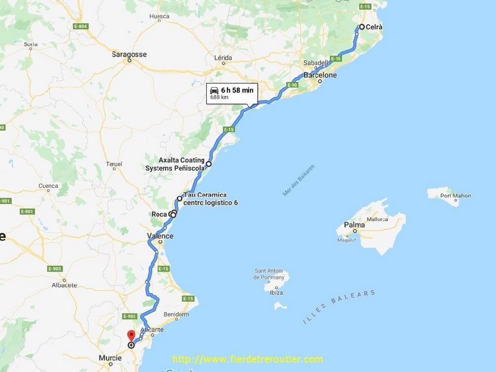 Une demi heure de coupure passé Montpellier et je suis en règle. Depuis 7h ce matin l'amplitude a bien dérouillé, mais ça je le savais d'avance. Pour pas que je m'ennuie, Franck m'a envoyé les 7 ramasses que j'ai de prévu, en gros ça démarre à Castellon jusqu'à Cox (Murcia), il va falloir la jouer fine. Je finis par me poser à l'entrée de Celra, au calme, du moins pas sur l'autoroute.