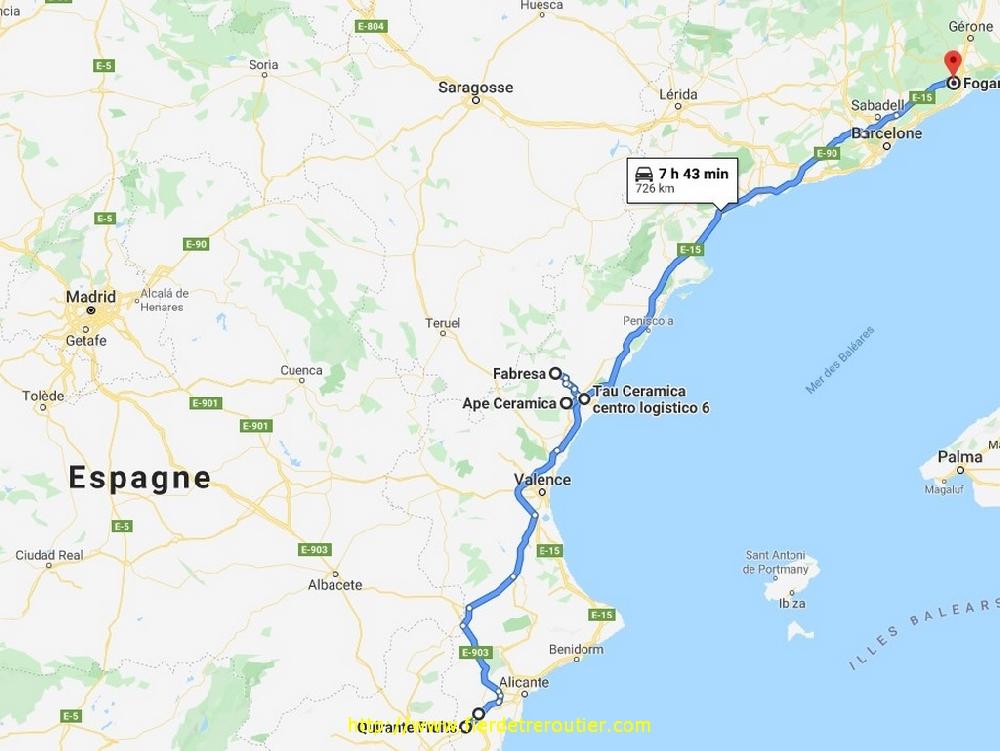 A midi je finis par débarquer à Peniscolà, coup de bol, il y a pas d'autre camion, je suis dechargé direct. Hier soir Franck m'avait envoyé mes ramasses, je me suis fait une prévision, en sachant que je dois faire une ramasse à Montcofa avant 16h. Comme je passe devant celle de Castellon, je tente, mais ça ne reouvre qu'à 15h30, ça fera trop juste, je file à Moncofa, et j'ai bien galéré pour arriver au bon bureau. J'ai 500kg à prendre, 3 bricoles de carrelage, mais il faut prendre RDV 48h à l'avance, et encore j'ai dû envoyer le BL par mail, et enfin j'ai pû charger. La suivante est à 1km, à Nules, mais ça ferme à 18h30, et l'autre Roca à Vall d'Uxo ferme à 17h, alors tant pis, je monte d'abord à Vall d'Uxo, il y a des camions dans tous les sens, j'ai juste une palette de 150kg, ça va vite, à 18h je suis de retour à Nules, ils sont cool ici, j'ai mes 3 ramasses pour aujourd'hui, vu l'heure j'en ferai pas d'autres.