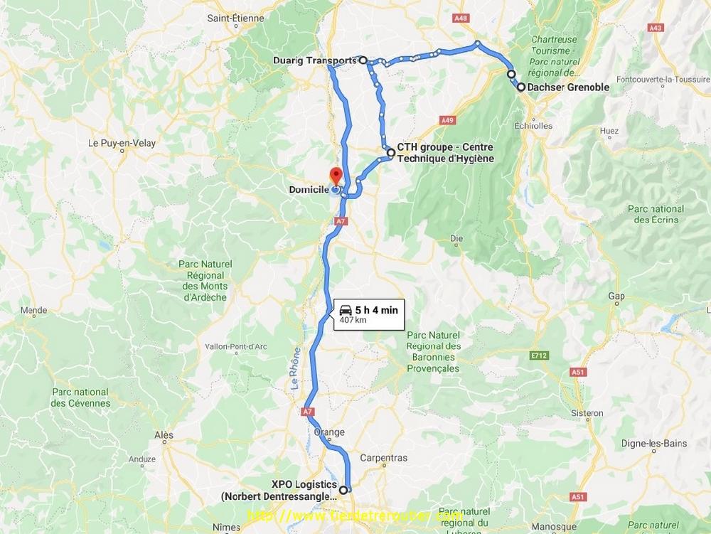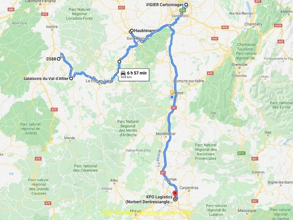 Il est déjà midi quand j'ai fini à St Rambert, ils me remettent 3 cuves vides à ramener à Chambalud. 30km en 5h, j'en peux plus. Retour à Jarcieu city, j'ai un lot de 33 palettes qui m'attend depuis hier pour l'espagne. c'est aussi depuis hier que la coupure de l'A7 à Valence est annoncée pour 13h30. Psychologiquement je m'étais préparé à éviter le secteur en passant par Romans, sauf que quand je pars c'est toujours ouvert, pas la peine de definitivement achever la conso du mois, je mets quand même le cap par la vallée du Rhône, mais je reste sagement sur la N7.