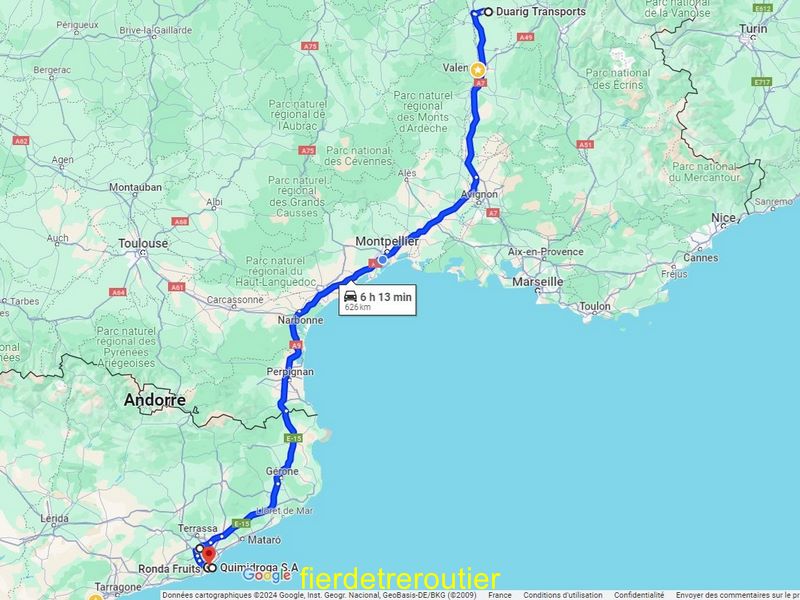 Une descente sans stress sans pression, y a rien de pire finalement. L'avantage c'est que la conso respire, par contre je suis loin d'être le seul cette nuit, c'est blindé de camions. Une bonne demi heure de cassage de graine sur le parking du cadran solaire à Tavel, calme absolu, j'y serait bien resté 48h. Je termine ma première période à La Palme ou j'arrive en même temps qu'un Carrion. Le chauffeur vient me voir carrement pour me taxer un café, j'avais encore jamais vu ça. Bien sûr je lui ai offert, mais quand même gonflé le gars !