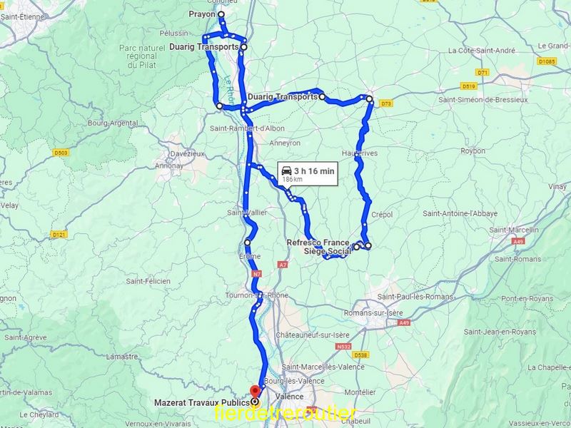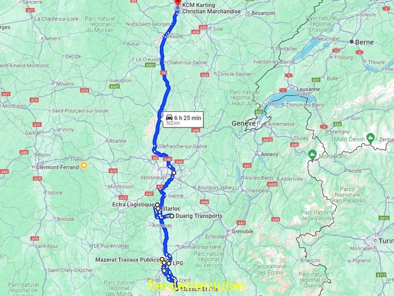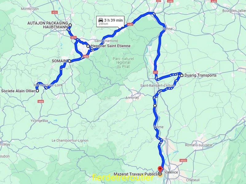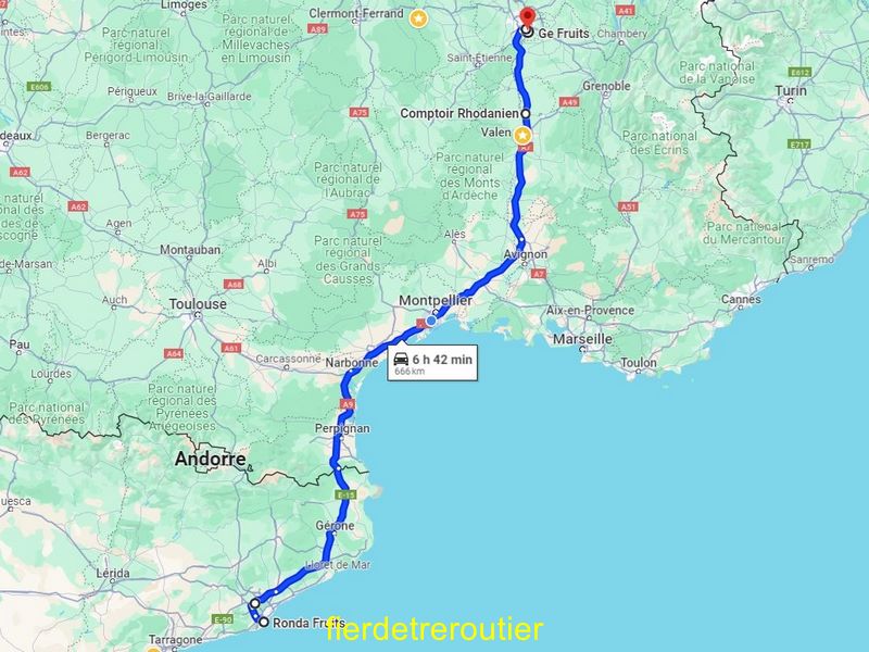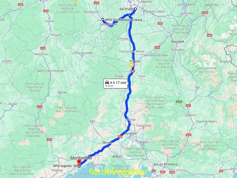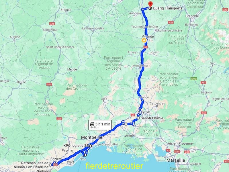 Retour vers la Rhone Valley, ou je suis noyé sous un flot de ramasses. J'attaque à Etoile/Rhône, puis Portes Lès Valence, là, c'est pas prêt avant 11h30, ça me laisse 1h pour prendre une palette à Valence, 4 à Montéleger et revenir. Mauvaise surprise une fois à quai, j'ai gardé le transpal de Montéleger dans la remorque ! Je vais pas devenir malhonnete à 54 ans, je les appelle et ramène le transpal, comme je m'en doutais ils avaient rien vu. De là, je file direct vider la palette de Valence à St Clair du Rhône, en même temps j'en récupère 3 pour Rousset. Cet aprème c'est un vrai repère de Duarig ici, on était 4. Pour finir je prends une palette pour le Togo à St Maurice l'Exil, mais je sens que je vais pas y aller vu que je suis en vacances à la fin de la semaine.