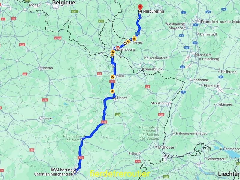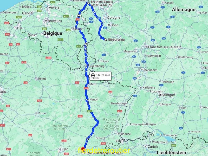 No stress ce matin, je vais voir à pieds si mon client est ouvert. En passant je remarque une jeune gamine qui avait posé sa trottinette hier soir face au centre de tri de la poste, elle repart juste, courageuse la gamine qui a bossé toute la nuit pendant que je dormais comme une feignasse que je suis. Mon client est déjà sur le pied de guerre, ici ils sont les specialistes du karting, là j'ai 3 palettes de bidons d'huile, il y a de quoi faire. J'ai démarré à 8h, 10 minutes pour vider, ce qui signifie qu'il me reste 9h59 et 14h50 d'amplitude pour faire les 495km pour rejoindre le Nurburgring, j'ai donc le temps.