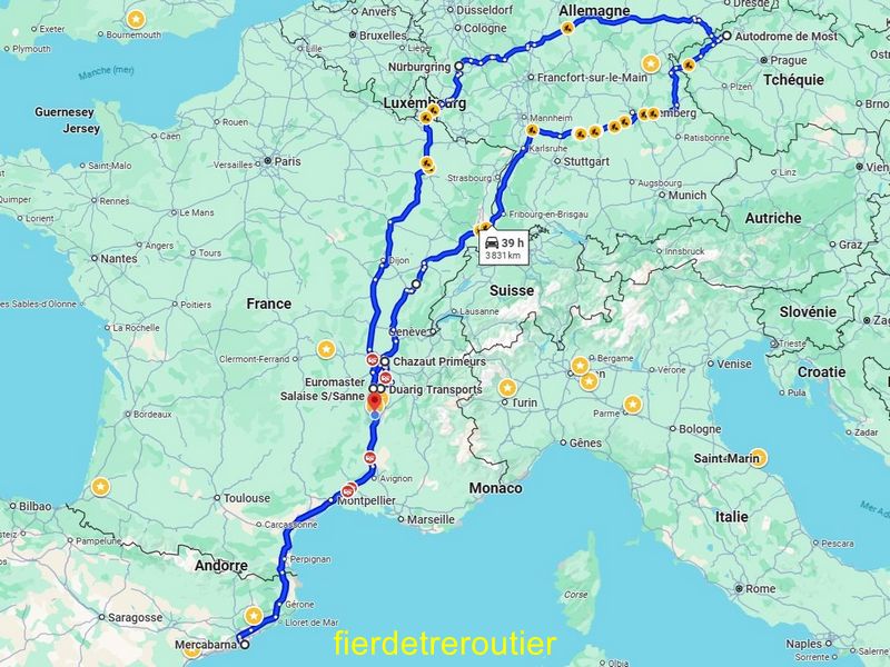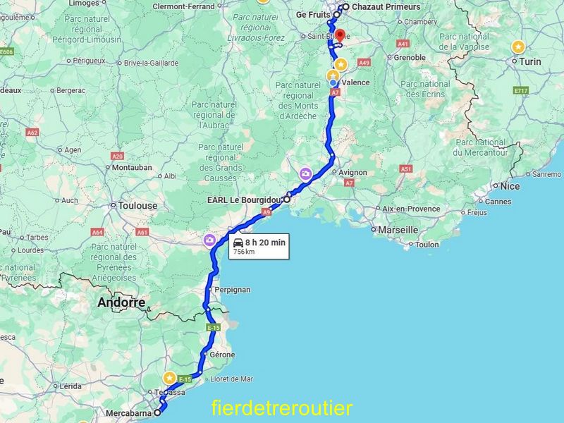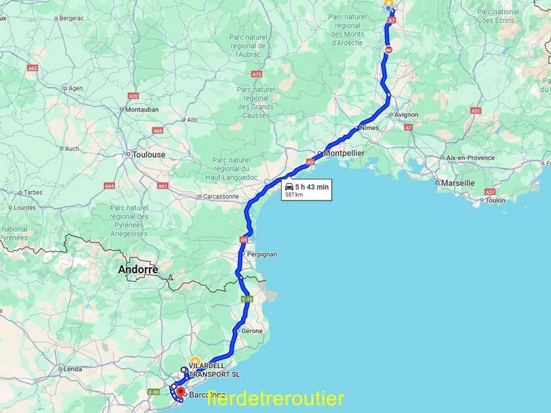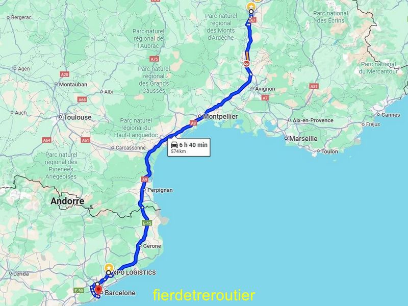 C'est bien la première fois que je ne pars qu'avec 8 palettes d'ici, par contre j'ai les ramasses à faire en montant, pour Ludo lui ce sera du Lyon mais pas que du simple non plus, en saison creuse, on prend ce qu'il y a hein ! A peine parti, j'ai un message d'alerte adblue "couple réduit dans 10h", c'est cool j'avais peur de m'ennuyer en cette fin de semaine qui approche. Si la sortie de Barcelone a été facile, c'est pas la même pour passer le Perthus, mais à force, j'ai remarqué qu'en se mettant au milieu à mi descente, on grattait pas mal de places et de minutes, c'est pas que je sois pressé, mais j'ai un compte à rebours qui compte les minutes de moteur tournant. Avec le temps perdu, j'ai quand même réussi à monter jusqu'à Gigean.