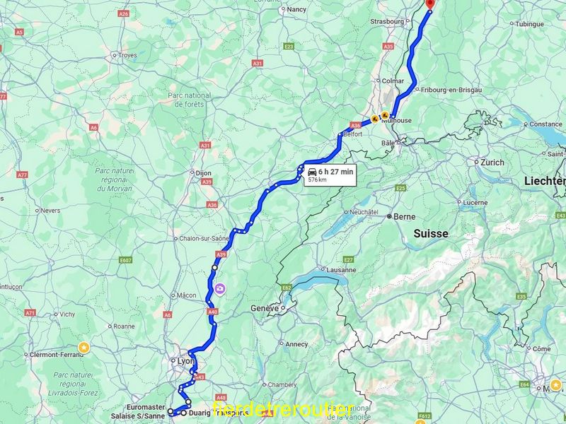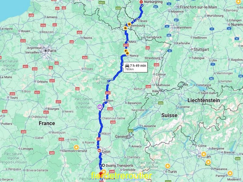 Il est quasi 17h quand c'est fait, et je ne me sens pas la moelle d'affronter l'A7 et encore moins l'A46. Donc, d'ici, je me suis mis en mode tourisme et j'ai rejoint ma route préférée par Cours et Buis, on est bien tranquille pas là d'autant que je suis chargé mais pas trop. Je récupère l'autoroute à Ambérieu et comme je commençais à avoir les crocs je me suis arrêté à Bourg en même temps qu'il s'est mis à pleuvoir. Le parking était quasi vide, j'étais bien. J'en étais au yaourt quand un porte voiture Lituanien vient se coller à moi. Le type m'interpelle : "Frigo?" En traduction bachiste ou Porte voituriste, ça veut dire "es ce que le bruit du frigo va nous casser les couilles toute la nuit ?" Là, je me suis dit, lui, il est vraiment très con, plus que la moyenne, il y a de la place partout, je l'ai envoyé carrément chier. Alors, il a reculé en se faisant bien caguer, mon frigo était pas en route bien sûr, en carburant… J'ai fini mon yaourt et je me suis tiré.