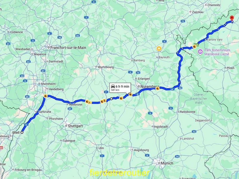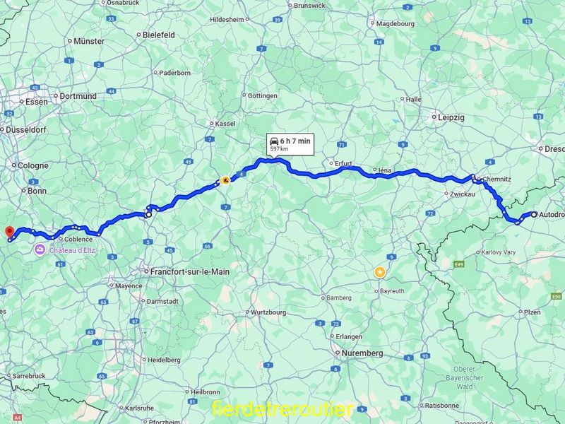 J'ai bien tenté de faire la sieste après-midi, mais la chaleur et le bruit ne font pas bon ménage ou que ce soit. Si j'ai dormi 1h c'est le bout du monde, mais c'est mieux que rien. En fin d'après-midi c'est la pluie qui s'est invitée. Ce soir je dois rejoindre Nurburgring en moins de 9h de préférence. Il faut mettre toutes les chances de son côté, j'opte pour un départ à 19h, c'est l'heure du souper. J'ai pas à rouler bien longtemps en république Tchèque, puisqu'après la riante traversée de Chomutov et ses superbes barres HLM j'entame la montée des monts Métallifères, en haut il caille à la frontière, remplie de magasins pour touristes, y a des gros panneaux interdits aux camion, c'est dommage ils vendent plein de jolis nichoirs pour piafs. Pour s'occuper, le douanier me demande le passeport et oui, un français, né en France et qui a fait l'armée aussi et je t'emmerde. Comme j'en ai marre de me faire flasher j'avais décidé de descendre sur des œufs jusqu'à Chemnitz. C'était sans compter sur un citernier allemand qui descendait non pas sur un œuf, mais une palette complète, 55, 56, parfois 58, j'ai cru mourir. A peine je m'en suis séparé que j'ai eu un autre pire que mou pour passer Chemnitz, y a même un willi qui nous a doublé. De retour sur l'A4 je peux enfin rouler peinard, sans trop forcer je suis arrivé faire ma 45 à l'extrème ouest de la DDR, la Shell de Eisenach.