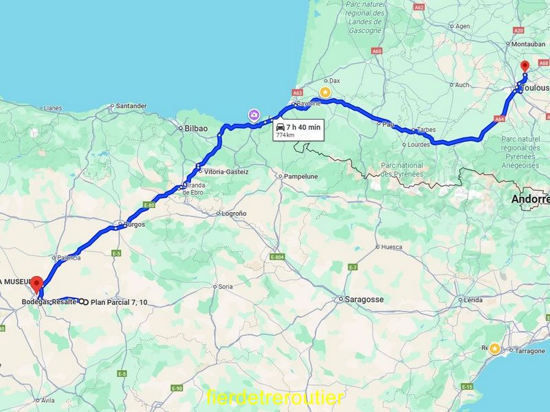 En partant, le cariste m'indique un autre chemin, plus plat pour rejoindre la nationale, mais par contre gross stress comme on dit en Espagnol pour sortir. Le complément est à 70km de là dans une immense bodega à Cigales. J'avais hésité un peu après Valladolid, et finalement j'ai quand même tenté de passer par le centre du pueblo, c'est pas hyper large mais ça le fait. Le domaine est gigantesque, propre, j'y connais rien en vin du Duero, mais ça sent grave le pognon ici. 19 palettes à prendre ici, le cariste est pas super causant, mais diablement efficace. En 30 minutes c'est chargé, il est 11h, 1200km encore et c'est la maison. Mais avant de rentrer dans le vif du sujet, un arrêt s'impose, il est l'heure de déjeuner et se faire couler un bain. Je fais ça au Zamorano juste avant Palencia, typique et bondé de vieux, de jeunes, de touristes, de paumés, toute une faune bruyante. Encore une grosse demi heure le tout, les compteurs sont remis à 0, je peux maintenant chausser mes semelles de plomb. Presque pas de trafic, encore moins de camions, ça file, du moins jusqu'à Burgos, après au plus je monte vers Irun, au plus ça roule. Pour garder la couleur locale pour une fois que je suis pas en ADR, j'ai pris l'Echegarate. Si on se fie à Map, ça fait 8km de plus mais c'est tellement plus sportif. Passé la frontière je fais un stop à Bidard, c'est moins drôle.