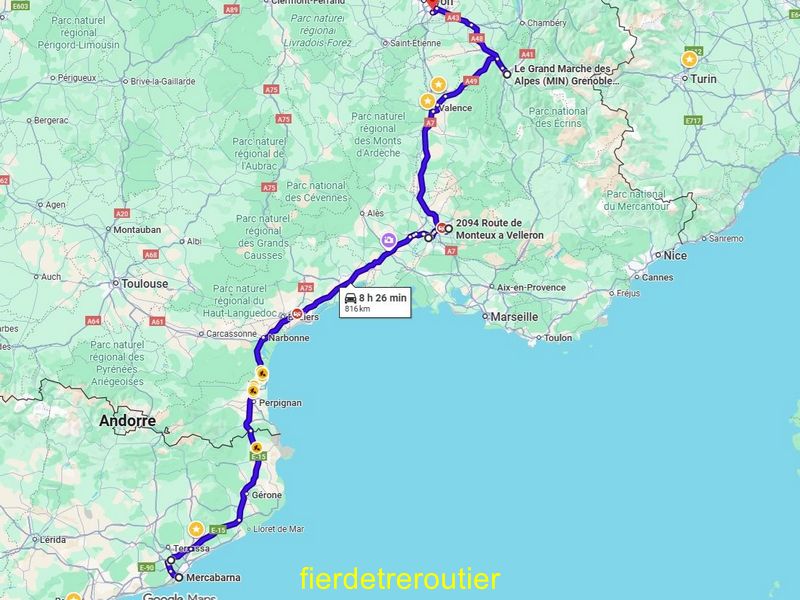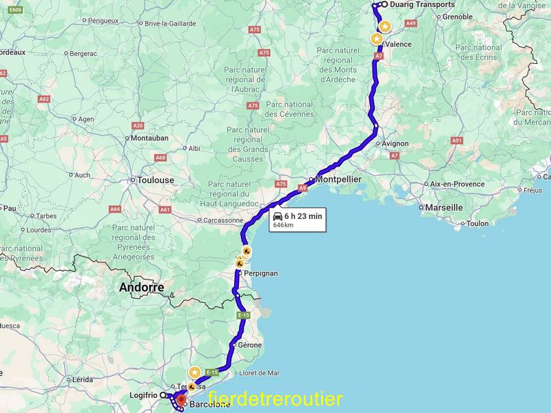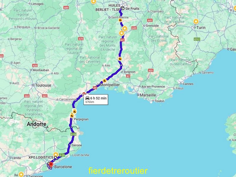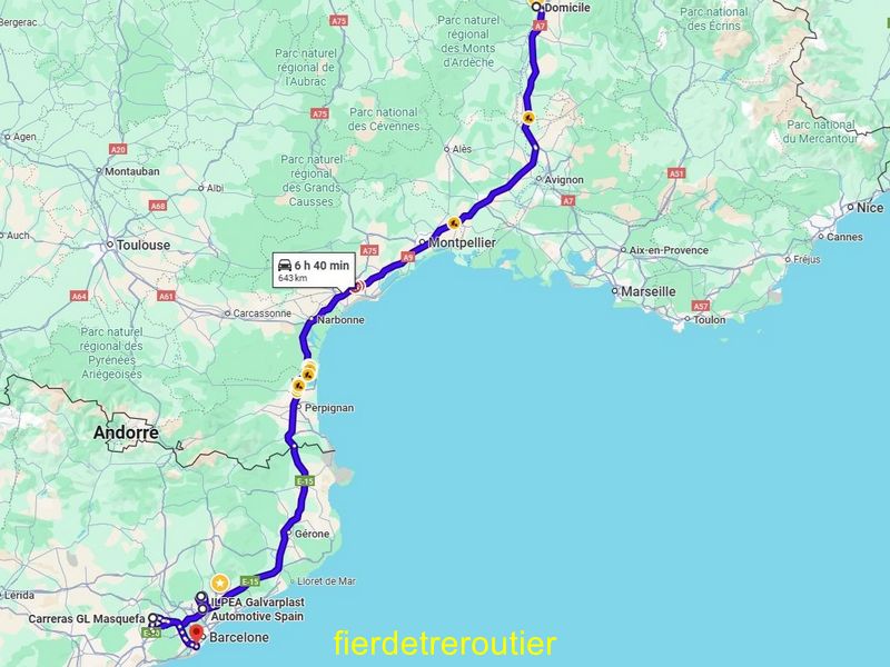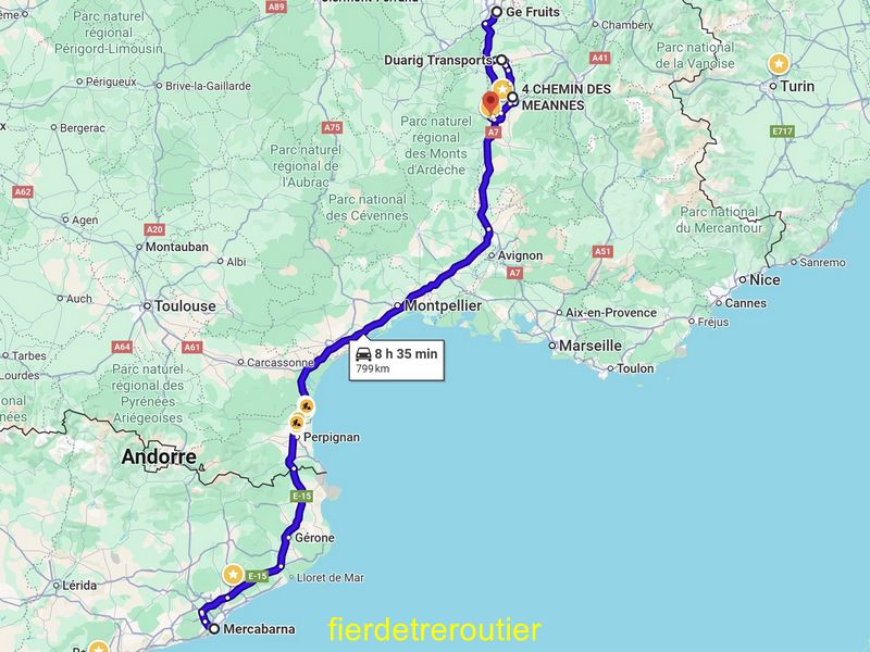 Je m'arrange avec Kévin chef de quai chez Fourka Family qui me donne le feu vert pour acular pronto. Il est 16:30. Aussitôt en place je me jette sous la douche, je suis presque chargé quand j'ai fini. Bien sûr je pars en pleine binz, mais à force de feinter je limite un peu les dégâts, 1:10 à la Roca. Bien sûr j'ai averti le premier client à Bourg St Andeol, arrivée prévue entre 00:30 et 00:45. Après Barcelone ça roule tranquille c'est même plutôt calme. Les 4h15 sonnent à 2km de loupian, parfait, j'ai faim.