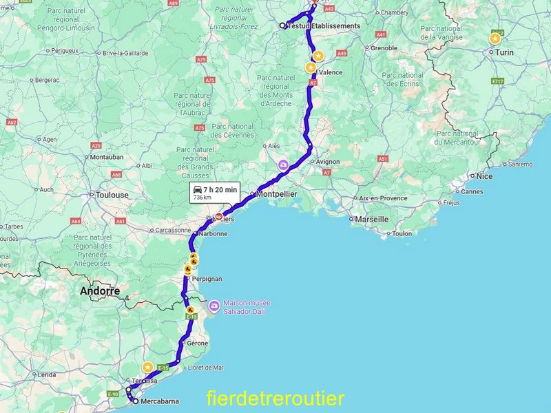 En moins d'une heure c'est réglé je me taille. Objectif : Santa perpetua de mogoda direct. Je chausse mes semelles de plomb et en avant. Distrait par les magnifiques potagers qui bordent l a6 après Villefranche-sur-Saône, j'ai pris Lyon Centre et je me suis retrouvé au Fourvière Tunnel. Entre midi et deux ça passe crème. A Chasse le vent du sud souffle si fort que c'est la tempête sur le Rhône, impressionnant ! Arrêt à Roussillon pour se nettoyer vite fait, et surtout pas plus de 45 minutes. Aujourd'hui pas de problème sur la route, c'est rare. Je remets les compteurs à zéro à Nîmes Margherita lol. Il faut encore faire de gros efforts pour arriver au bout en moins de 4:30. Merci Volvo et mon pied droit. Je me gare à 21:15, 9h52 de volant. Ouf. Le tout au calme à 200m du client.