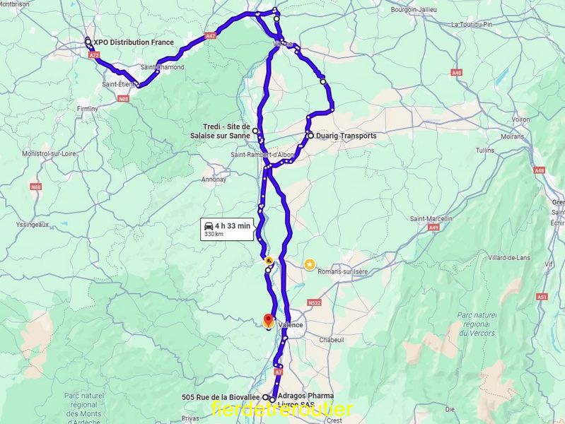 Entre le chargement les signatures ça a pris quasi 2:00 maintenant ça a tout viré au rouge vif à Lyon. C'est justement pour ça que je dois aller m engouffrer chez Daf à St Priest récupérer une pièce. Personne n'est au courant un vrai sketch. Le plus drôle c'est quand je suis rentré au garage je devais avoir l'air perdu en regardant les pancartes des différents guichets je me dirigeais vers "magasin" quand un Hindou de chez Hoptrans me faisait signe non non en me désignant "Atelier". J'en déduis que j'ai une tête de chauffeur paumé hoptrans ou hegelman.