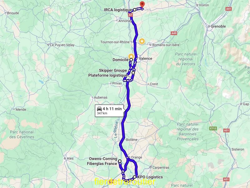 Une fois n'est pas coutume, il est 8h quand je pars de la maison. C'est férié en Espagne, donc c'était pas la peine de descendre hier soir. Bien sûr ça change toute notre organisation habituelle mais sinon on s'ennuirait. J'attaque de l'autre côté du château de Crussol, première ramasse à la logistique des transports Comte. 5 palettes pour l'Italie, c'est prêt, la semaine commence bien. Du temps que le trafic commence à se fluidifier je vais chez Ladreyt, autre fleuron du transport, plus que centenaire, c'est une institution ici. La je prends 3 palettes pour Piacenza. Je finis quand même par aller à l'extrême sud de l' agglomération Valentinoise pour prendre 3 palettes pour Tarragone chez Skipper à Etoile sur Rhône. Ici il y a 2 bâtiment de chaque côté de la route je vais jamais au bon du premier coup.