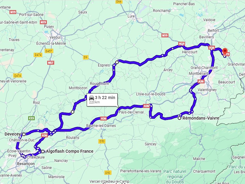 Le réservoir de mazout sonne creux, je passe au dépôt vite fait. Cette fois je prends un peu d'autoroute jusqu'à L'Isle sur le Doubs, faut livrer foulée. Sur les coups de 16h je suis à Pont de Roide chez un emboutisseur, deux palettes c'est vite fait.