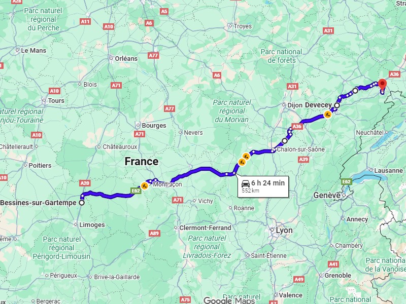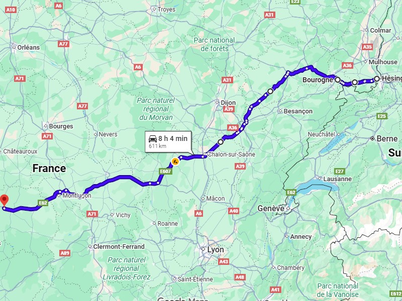 Je me fais un premier quart d'heure un peu avant Pont à Mousson. A Nancy le GPS veut me faire passer par l'autoroute ; Langres Dijon j'imagine. T'as entendu parler de la route des Vosgiens ? Après Pesmes j'ai 4 heures de volant bien tassées, je m'arrête manger vers les 4 fesses.