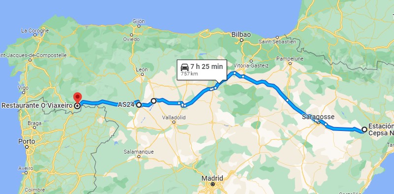 A 9h pétante je suis à A Estrada, un numéro en +34 m'appelle, me demande où je suis. Le gars me tutoie, donc moi pareil, je me dis que c'est le monteur. Je lui raconte que je suis garé dans une rue que j'ai repérée sur Google. Je vais voir à pied si je peux approcher... A l'adresse indiquée il y a des barrières jaunes et l'arrêté municipal accroché, c'est fait dans les règles. Le gars arrive dans une grosse Merco genre GLE je crois. En fait c'est pas le monteur mais le client. Je l'ai tutoyé, pas grave, en Espagne tout le monde tutoie tout le monde, hormis le roi et les flics et encore... Je retourne chercher le camion. Je livre une piscine « couloir de nage » et rallongée de 3m encore, je ne m'expliquais pas comment c'est possible en pleine ville. En fait le gars a une maison de maître avec un terrain gigantesque enclavé, tellement grand qu'il fait poser la moitié d'un bassin olympique dans son jardin. Le type est blindé et bien sympa. Pour repartir c'est plus simple, je tire tout droit et je tombe sur une nationale, fastoche.