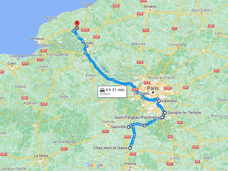 Bon ben allez, fonce tonton ! Bouloire St Calais Orléans, la route normale quoi. Ça roule pas mal, pas de chieurs, peu de tracteurs, je me suis annoncé pour 18h au dépôt, mouais j'ai été un peu optimiste le GPS dit 18h30 et sans coupure... Je boucle la première période de 4h30 à hauteur de Montargis, où il y avait le garage RVI autrefois. Après c'est plus facile, il n'y a que le bout avant Courtenay où on ne peut pas doubler mais ensuite tu fais ton bonhomme de chemin.