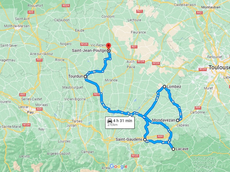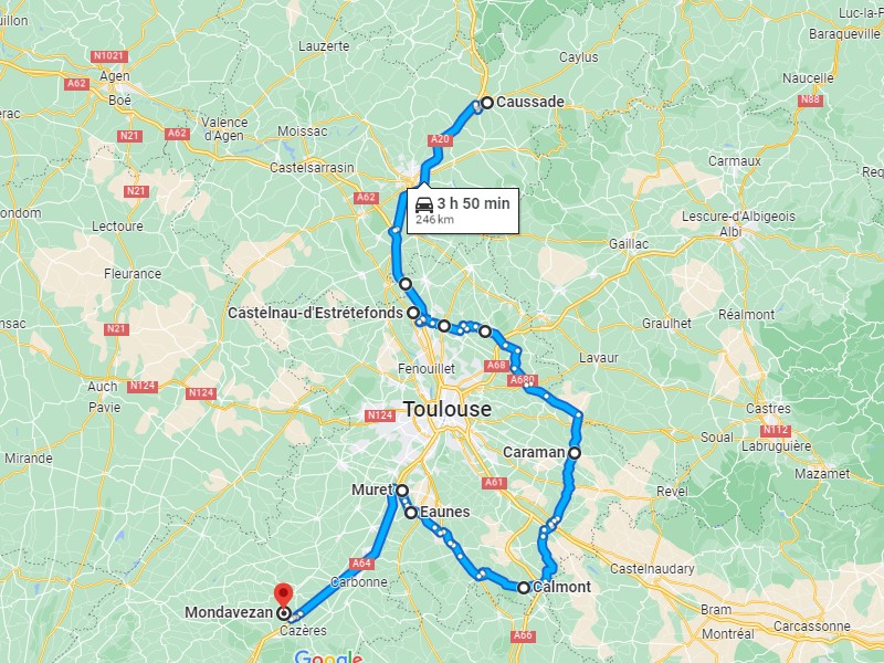Café croissant douche et zou ! Je commence à Castelnau d'Estretefonds, le bled de Cassoulet, sauf que là c'est pas vers chez lui, trop facile, c'est un chemin étroit de l'autre côté de l'autoroute. Je trouve à me garer à l'arrache à 100m de la maison. Si je me fais dégager faudra pas pleurer... Je fais mon truc, tranquille, personne n'est venu râler, au poil.