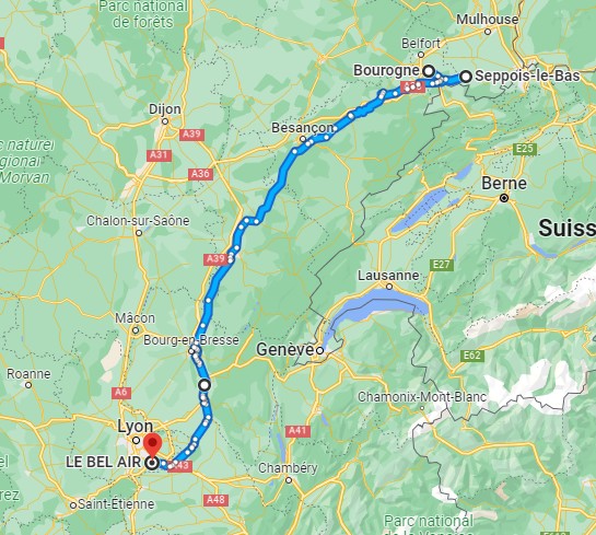Je devais commencer cet après-midi à La Verpillière, du coup je n'ai qu'à rouler. Autant dire que c'est pas le stress qui m'envahit, je descends full petites routes : Clerval, Baume les Dames, Pont les Moulins, Nancray, Lons le Saunier, Bourg, SQF, Heyrieux.