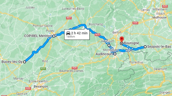 Je pense que c'est impossible de démarrer plus cool, à 8h et demi je fais les 4,1km qui me séparent de bâches Laily à Grandvillars. On charge 2 couvertures Solaé.