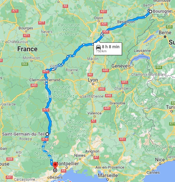 En repartant du bled je vois les coulées de cailloux, de feuilles, de branches sur la route, ah ça a lavé la route ! Il me reste un petit deux heures à rouler, je descends à Paulhan, Béziers c'est trop loin, pas grave Paulhan c'est très bien. Je me gare avec 9h52 de volant, parfait.