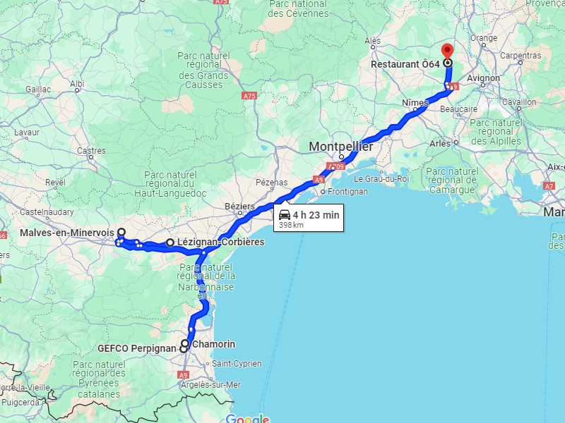 Ce matin c'est douche dans la chambre 8, n'y voyez rien de classieux, on se lave c'est tout. Un peu avant 8h je suis à Malves en Minervois. J'avais bien vu que ça allait être chiant, j'ai pris un peu d'avance. Ma rue est en haut du bled, je pensais contourner par la droite mais ça va pas du tout, le quartier est interdit aux 19t, c'est pas ça le problème, c'est la longueur. C'est bien plus petit que l'idée que j'en avais sur Maps. J'arrive à faire demi-tour entre deux maisons, je redescends et je vais me retourner sur la grande route pas le choix. Je reviens et je contourne par la gauche cette fois. C'est pas mieux, j'arrive à me retourner dans un putain de dévers et me garer sur une plate-forme en béton qui doit être de l'ancienne cave coopérative. J'ai bien fait de ne pas aller plus loin, je suis à 300m de la baraque, où j'espérais faire demi-tour les lieux ont changé depuis le dernier passage de Google, il y a un point recyclage, déjà ça aurait été chaud mais là c'est mort. Pas de regrets. Je livre en deux tours, la maison des clients est en contre-bas de la route, il me faut descendre en marche arrière avec le chariot sous peine de perdre les palettes dans la descente.