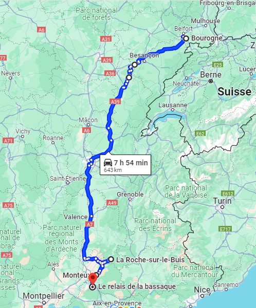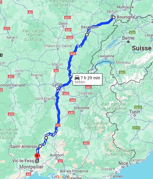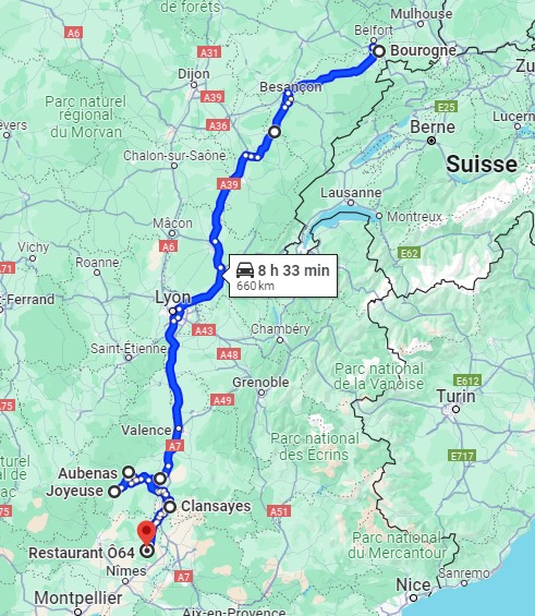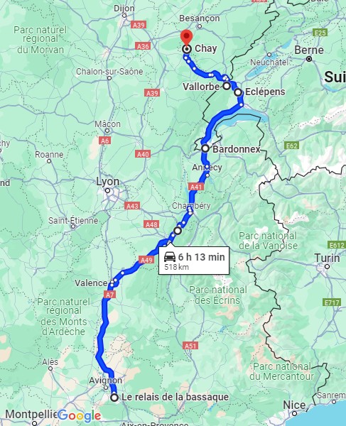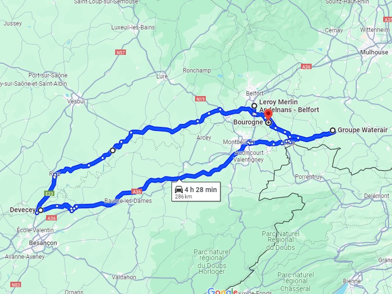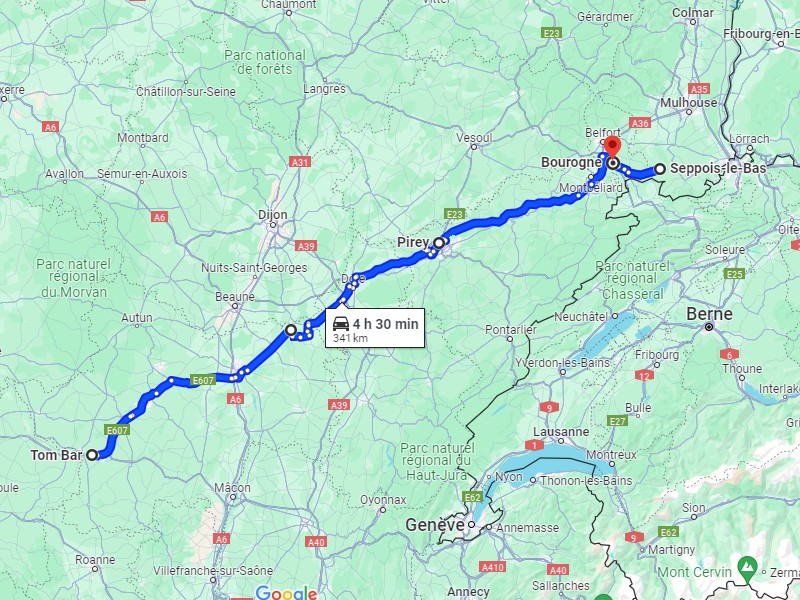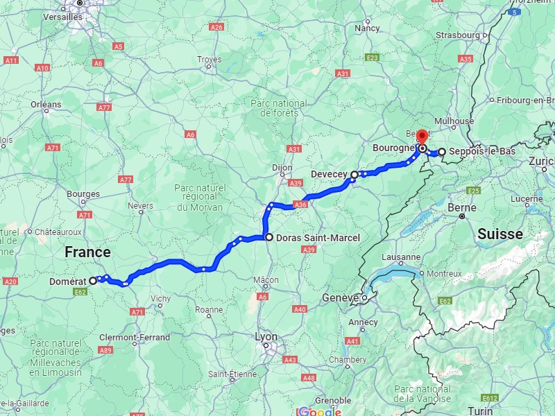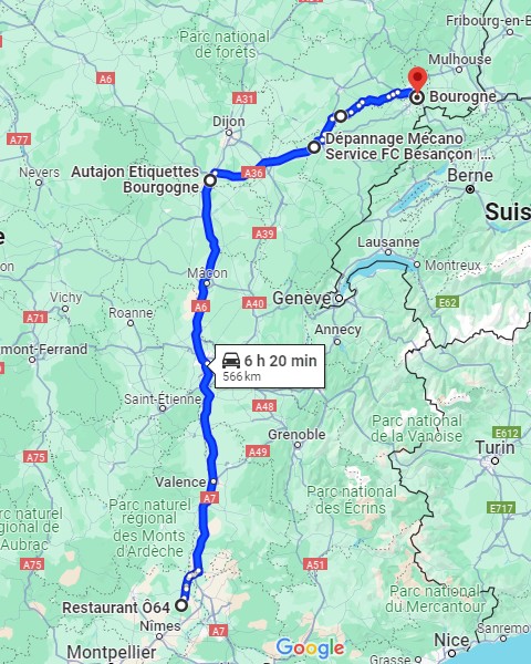 A 7h et demi je démarre de Bourogne, le premier client est à plus de 10h de volant, je ne livre rien aujourd'hui donc, j'ai le temps, je passe par la Haute-Saône. Il y a du beau monde par ici, je croise mon collègue Sylvain puis Ludo 25 dans le grand virage à Vellechevreux.