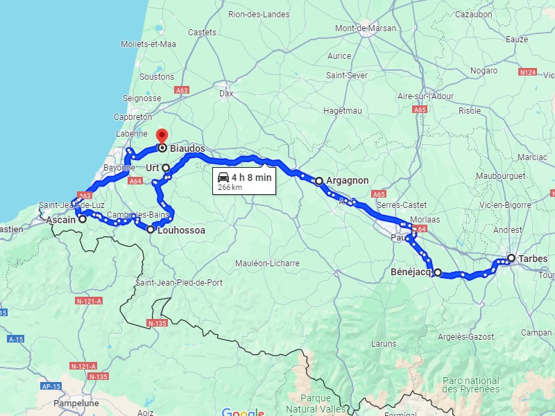 Je redescends dans la civilisation, rebelote les virages. A 17h je suis à Ascain, encore un joli village basque mais pas adapté aux semis. J'avais bien vu sur Maps que ça n'irait pas, je vais voir à pied mais c'est mort, il faut tourner au coin d'une maison...j'oublie. Garé vers le cimetière je suis à 900m, j'y vais en deux fois, encore des gens charmants, la pluie a cessé, il y a même un rayon de soleil, ça change. Le bled fait un genre de sens giratoire, impossible de repartir comme je suis venu. J'arrête un camion benne 8x4 avec un porte-char et une pelle dessus, il m'explique l'astuce pour repartir.