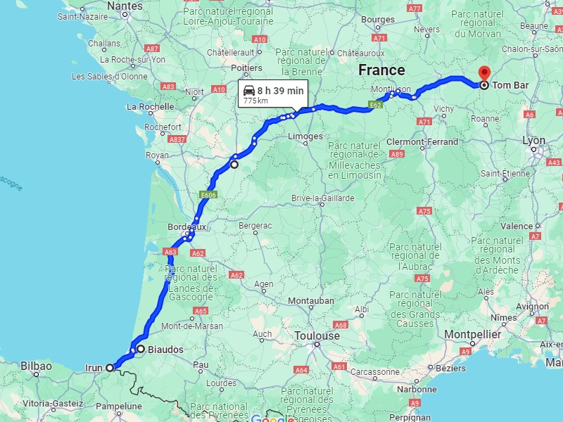 Café, pain-beurre, douche, je démarre vers 7h. On recharge chez Bion à Irùn, je sais bien que chez eux c'est pas la peine d'y aller avant 8h et demi, voire 9h. Je vais au gas-oil avant, ça c'est fait. A 8h et demi je me mets à quai après avoir sorti ma Solaé et fait bouger des kolegas LT qui squattaient là.