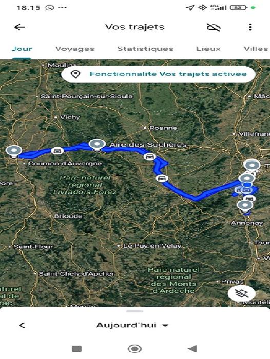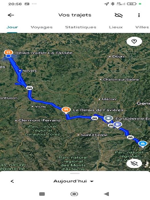 Je coupe à Veauche, alors que je suis proche de la fin de ma période de conduite ; il est 20H45. On s'arrête là. J'ai eu mes deux petits fils au téléphone. Ils étaient contents, car Mamoune avait fait des crêpes. Allez bonne nuit, les petits, le marchand de sable va passer.