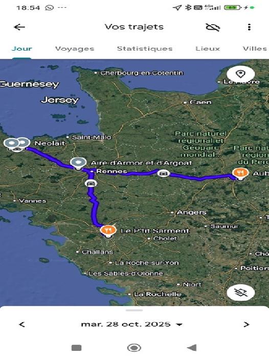 J'attends 8H15, puis je lève les voiles. Je récupère l'autoroute quelques instants plus tard et ceci jusqu'à Rennes, puis c'est de la 2 X 2 voies jusqu'à destination.